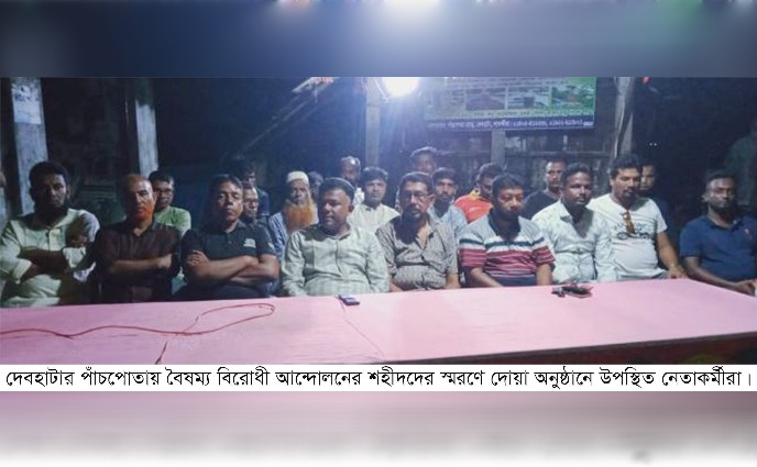 সাতক্ষীরার দেবহাটার পাঁচপোতা বাজারে বৈষম্য বিরোধী আন্দোলনের শহীদদের আত্নার মাগফিরাত কামনায় দোয়া অনুষ্ঠান করা হয়েছে।