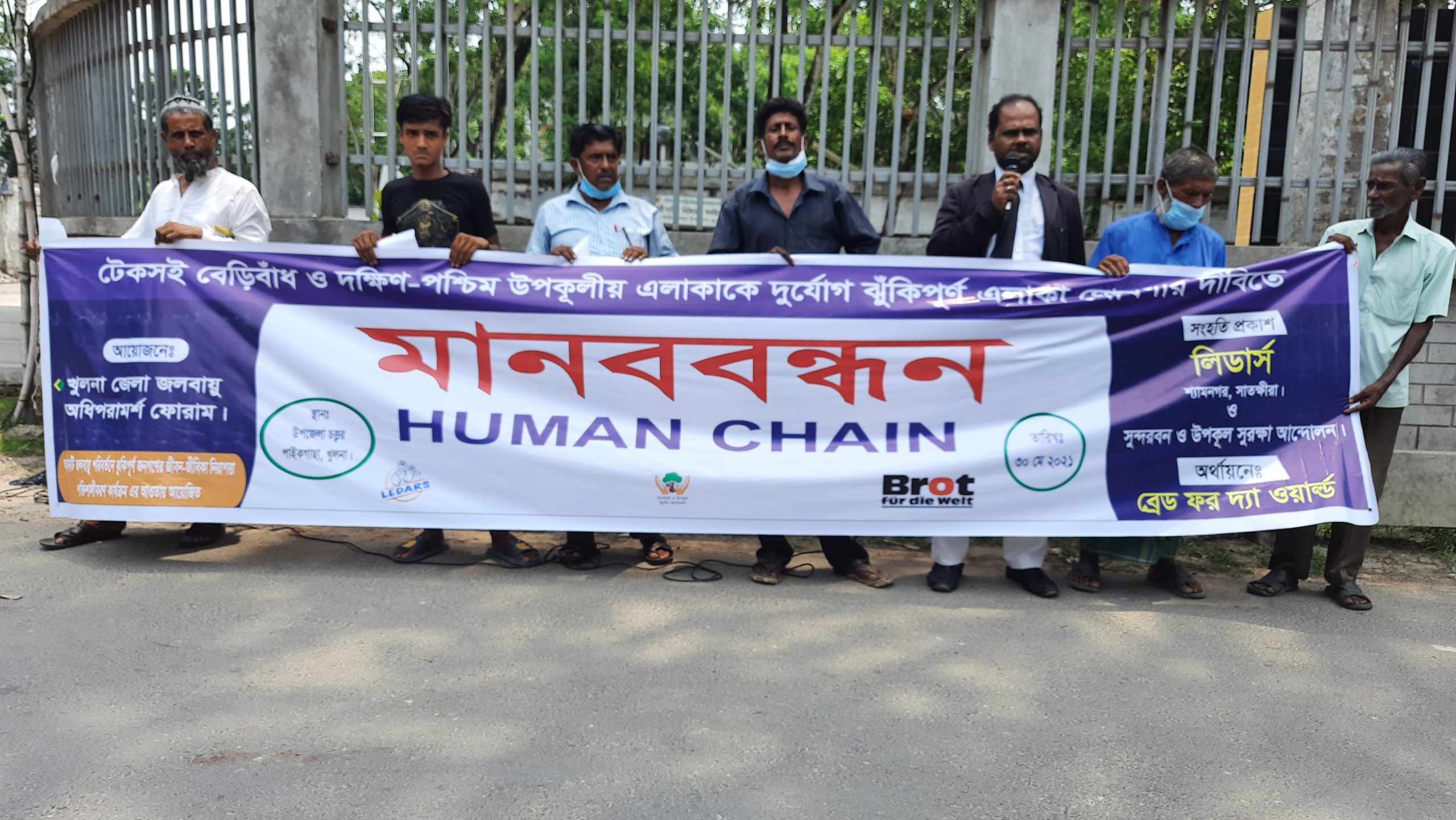 মানববন্ধনে বক্তারা বলেন, “টেকসই বেড়িবাঁধ পুনঃনির্মান ও দক্ষিণ-পশ্চিম উপকূলীয় এলাকাকে দুর্যোগ ঝূঁকিপূর্ণ এলাকা ঘোষণা করতে হবে। সরকার সিডর, আইলা, রোয়ানু, মোরা, ফণী, বুলবুল ও আম্পান এর পর উপকূলীয় এলাকায় মেগা প্রকল্প বাস্তবায়ন করার কথা বললেও আজও তার বাস্তবায়ন হয়নি। শুধ দুর্যোগ এলেই মেগা প্রকল্পের কথা বলা হয়। দুর্যোগ কেটে গেলে মেগা প্রকল্পের কোন খোঁজ থাকে না। সম্প্রতি সাইক্লোন ইয়াস এর প্রভাবে উপকূলীয় এলাকায় উচ্চ জোয়ারের কারনে খুলনা জেলার কয়রা ও পাইকগাছা উপজেলায় বেড়িবাঁধ ভেঙে লোনা পানিতে মানুষের জীবন-জীবিকা, সম্পদ, খাদ্য, পানি, বাসস্থানসহ অন্যান্য সংকট সৃষ্টি করেছে। এই সংকট পুরণ হওয়ার নয়।” এজন্য অচিরেই টেকসই বেড়িবাঁধ নির্মানের দাবী জানান মানববন্ধনে বক্তারা।