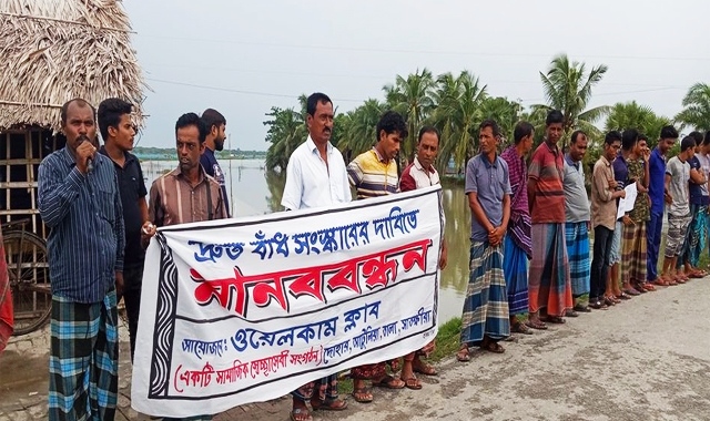 সাতক্ষীরার তালা উপজেলার জালালপুর ইউনিয়নের টিআরএম বাঁধ সংস্কারের দাবীতে মানবন্ধন অনুষ্ঠিত হয়েছে। মঙ্গলবার সকালে জালালপুর ইউনিয়নের দোহার-আটলিয়া গ্রামের ওয়েলকাম ক্লাবের আয়োজনে এ মানববন্ধন অনুষ্ঠিত হয়।