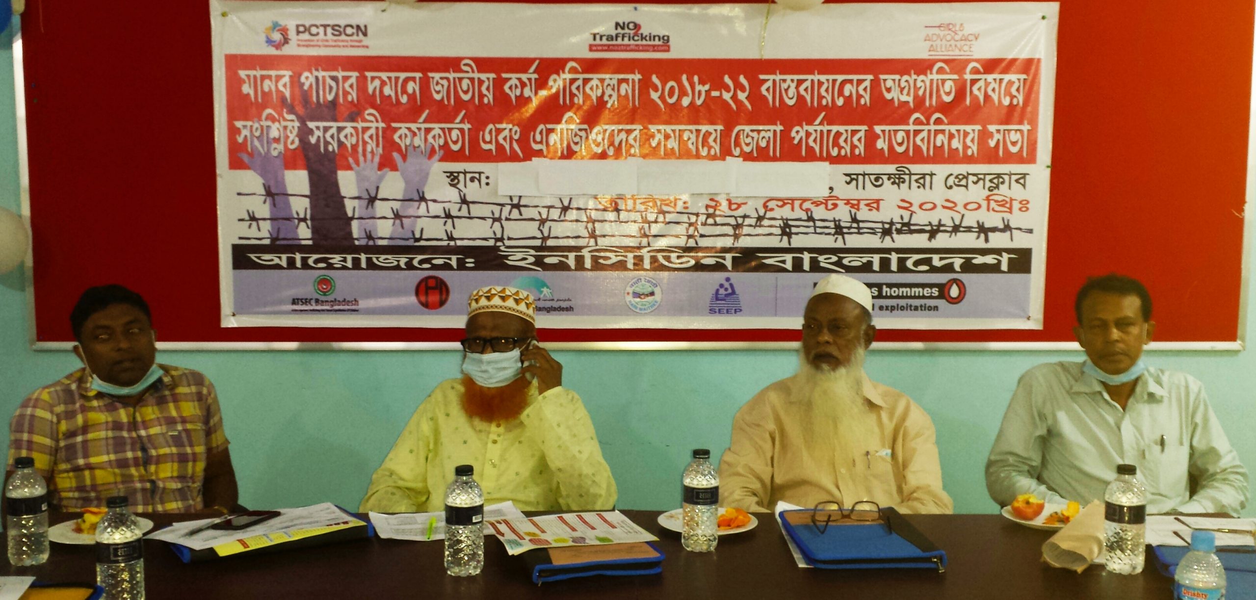 সোমবার (২৮ সেপ্টেম্বর) সাতক্ষীরা প্রেসক্লাবের বঙ্গবন্ধু মিলনায়তনে ইনসিডিন বাংলাদেশ কর্তৃক আয়োজিত শিশু পাচার প্রতিরোধ ও সুরক্ষায় এবং নারীর প্রতি সহিংসতা নিরসনের মানব পাচার দমনে জাতীয় কর্মপরিকল্পনা বাস্তবায়নের অগ্রগতি সভায় সভাপতিত্ব করেন জেলা দুর্নীতি প্রতিরোধ কমিটির সাধারণ সম্পাদক অধ্যাপক মোজাম্মেল হোসেন। ইনসিডিন বাংলাদেশ এর প্রতিনিধি সাকিবুর রহমান বাবলা'র সঞ্চালনায় সভার প্রধান অতিথি ছিলেন ইসলামিক ফাউন্ডেশনের উপপরিচালক মোঃ রফিকুল ইসলাম। সভায় বক্তব্য রাখেন জেলা কর্মসংস্থান ও জনশক্তির সহকারী পরিচালক মোস্তাফা জামান, অফিসার সমাজসেবা অধিদপ্তরের সহকারী পরিচালক মোঃ রোকনুজ্জামান, মহিলা বিষয়ক অধিদপ্তরের প্রোগ্রাম অফিসার ফাতেমা জোহরা জেলা আনছার ভিডিপি অফিসার হোসনে আরা,