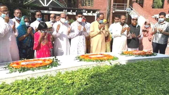 শ্রদ্ধা নিবেদনের পর পবিত্র ফাতেহা ও দুরুদ পাঠ শেষে তারা ১৯৭৫ সালের ১৫ই আগস্ট বঙ্গবন্ধু ও তাঁর পরিবারে নিহত সকল সদস্যের রুহের মাগফেরাত কামনা, বঙ্গবন্ধু'র সুযোগ্য কন্যা, বর্তমান সরকারের মাননীয় প্রধানমন্ত্রী শেখ হাসিনার সুস্বাস্থ্য ও দীর্ঘায়ু কামনা করে দেশের সার্বিক কল্যাণ কামনায় বিশেষ দোয়া ও মোনাজাত করেন।