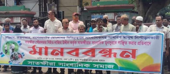 সাতক্ষীরায় সাংবাদিক মুনসুরকে লাঞ্চিত করার প্রতিবাদে মানববন্ধন