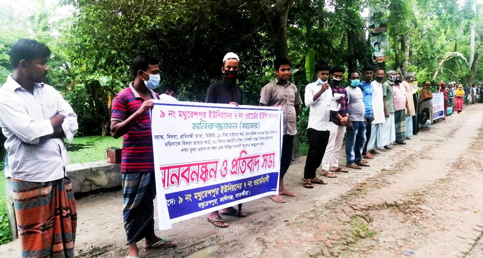 এসময়, এই ইউপি সদস্য মনিরুজ্জামান মনো বিরুদ্ধে মৃত ব্যক্তির টাকা আত্মসাৎ করা, টাকার বিনিময়ে অবিবাহিত মহিলাকে বিধবা ভাতা প্রদান, ৪/৫ হাজার টাকা নিয়ে সকল ধরনের কার্ড প্রদান ও একই বাড়িতে একাধিক কার্ড প্রদান, শীতের কম্বল না দিয়ে দোকানে বিক্রি, সরকারি কাজ দেওয়ার নামে ৩/৫ হাজার টাকা আত্মসাৎ, সরকারি কাজের কর্মসূচির টাকা জন প্রতি ২৮০০ টাকা করে আত্মসাত, সরকারি লোক নিয়ে নিজের পুকুর ও নিজেদের জমিতে ধান কাটা, সকলের আইডি কার্ড নিয়ে অনুদান নিজে ভোগ করাসহ সোলার, কল, পানির ড্রাম, কৃষকের ধান রাখার ড্রাম ও গরীবের সকল অনুদান আত্মসাৎ করা, সরকারি গমের টাকা আত্মসাৎ করা, রাস্তার কাজে শ্রমিকদের ২৫০ টাকা দেওয়ার কথা থাকলে ১৭০ টাকা প্রদান করা ও বিভিন্ন প্রজেক্টের টাকা আত্মসাৎ করার বিরুদ্ধে এ মানববন্ধন অনুষ্ঠিত হয়।