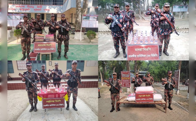প্রেস বিজ্ঞপ্তিতে জানানো হয়, গোয়েন্দা তথ্যের ভিত্তিতে সাতক্ষীরা সদর উপজেলার ছয়ঘরিয়া নামক স্থান কালিয়ানী বিওপির সদস্যরা ৫২৪ পিস ভারতীয় ইয়াবা জব্দ করে। তলুইগাছা বিওপির বিশেষ আভিযানিক দল সীমান্তের মজুমদার খাল নামক স্থান হতে ১০ বোতল ভারতীয় মদ ও ২ লাখ ১০ হাজার টাকা মূল্যের ভারতীয় ঔষধ জব্দ করে। সদর উপজেলা পদ্মশাখরা বিওপির বিশেষ আভিযানিক দল দক্ষিণ হাড়দ্দহা নামক স্থান হতে ৪৪ হাজার ৫০০ টাকা মূল্যের ভারতীয় রসুন জব্দ করে। একই উপজেলার কুশখালী বিওপির বিশেষ আভিযানিক দল শ্মশান ঘাট নামক স্থান হতে ১ লাখ ৪০ হাজার টাকা মূল্যের ভারতীয় ঔষধ জব্দ করে। ঝাউডাঙ্গা বিশেষ ক্যাম্পের একটি বিশেষ আভিযানিক দল কলারোয়া উপজেলার বোয়ালিয়া মাঠ নামক সীমান্ত থেকে ৫ বোতল ভারতীয় মদ জব্দ করে। কাকডাঙ্গা ও মাদরা বিওপির বিশেষ আভিযানিক দল কলারোয়ার ভাদিয়ালী সীমান্ত হতে ২৫ বোতল ভারতীয় মদ জব্দ করে। কাকডাঙ্গা বিওপির বিশেষ আভিযানিক দল কলারোয়া উপজেলার কাকডাঙ্গা মাছের ঘের ও ভাদিয়ালী মাঠ হতে ২ লাখ ৭০ হাজার টাকা মূল্যের ভারতীয় শাড়ী এবং ভারতীয় ঔষধ জব্দ করে। এছাড়াও, সদর উপজেলার ঝাউডাঙ্গা বিশেষ ক্যাম্পের একটি বিশেষ আভিযানিক দল বোয়ালিয়া মাঠ নামক স্থান হতে ৭০ হাজার টাকা মূল্যের ভারতীয় ঔষধ জব্দ করে। জব্দকৃত মালামালের মূল্য সর্বমোট ৯ লাখ ৫১ হাজার ৭০০ টাকা।