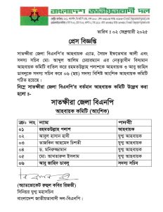 সাতক্ষীরা জেলা বিএনপি’র আহবায়ক এ্যাড. সৈয়দ ইফতেখার আলী এবং সদস্য সচিব মো: আব্দুল আলিম চেয়ারম্যান এর নেতৃত্বাধীন বিদ্যমান আহবায়ক কমিটি বাতিল করে রহমতউল্লাহ পলাশকে আহবায়ক ও আবু জাহিদ ডাবলুকে সদস্য সচিব করে ০৬ (ছয়) সদস্য বিশিষ্ট আংশিক আহবায়ক কমিটি গঠিত হয়েছে।