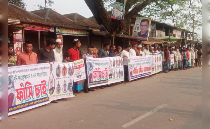 গোপালগঞ্জের মুকসুদপুরে ৪নং খান্দারপাড়া ইউনিয়নের ১ নং ওয়ার্ডের বিএনপির সভাপতি ইয়াছিন শেখকে হত্যার হুকুমদাতা পতিত আওয়ামী লীগের অর্থ যোগানদাতা ফ্যাসিস্ট শেখ হাসিনার দোসর ফায়েকুজ্জামান ও তার সহযোগীদের ফাঁসির দাবিতে মানববন্ধন অনুষ্ঠিত হয়েছে।