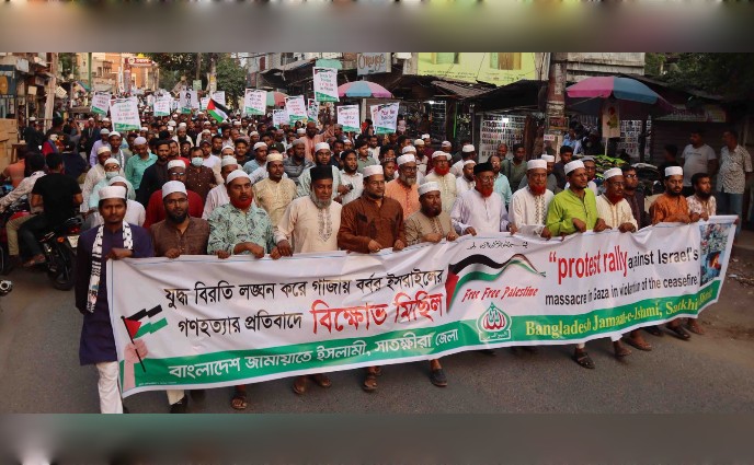 গাজায় ইসরায়েলি নৃশংস গণহত্যা ও বর্বরোচিত হামলার প্রতিবাদে বিক্ষোভ মিছিল ও প্রতিবাদ সমাবেশ করেছে সাতক্ষীরা জামায়াত।