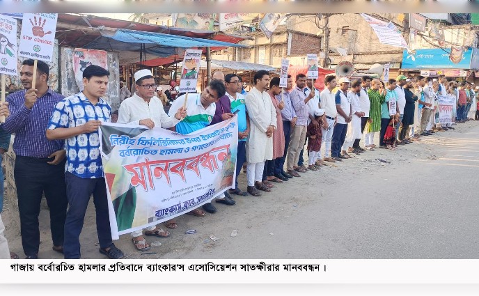 "নিরীহ ফিলিস্থিনীদের উপর ইসরায়েলী বাহিনী কর্তৃক বর্বোরচিত হামলার" প্রতিবাদে ব্যাংকার'স এসোসিয়েশন সাতক্ষীরার আয়োজনে মানববন্ধন কর্মসূচি পালন করা হয়েছে।