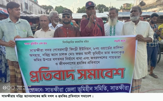 সাতক্ষীরা সদর উপজেলার গোবরদাড়ী ফিংড়ী ইউনিয়নে দরিদ্র ভ্যান চালক ফজর আলীর জমি দখলের চেষ্টা ও জীবননাশের হুমকির প্রতিবাদে সমাবেশ অনুষ্ঠিত হয়েছে।