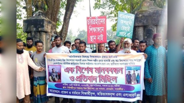 এসময় বক্তব্যে বলেন, গত কয়দিন আগে ওই শিক্ষক ও আয়া স্থানীয় জনতার মাধ্যমে ধরা পড়ে এবং পুলিশ কর্তৃক তাদেরকে আটক করে আদালতে প্রেরণ করে। এ ঘটনা ইতোমধ্যে সামাজিক যোগাযোগ মাধ্যমে ব্যাপক ভাইরাল হয়েছে এবং চাঞ্চল্যকর ঘটনাটি জাতীয় দৈনিকে সহ একাধিক স্থানীয় পত্রিকায় প্রকাশিত হয়েছে। বিষয়টি স্থানীয় সাধারণ জনগণের মধ্যে তীব্র অশান্তি ও ব্যাপক ক্ষোভের সঞ্চার হচ্ছে। দ্রুত সময়ের মধ্যে শান্তি নিশ্চিত না করতে পারলে এলাকাবাসীর সঞ্চিত ক্ষোভযেকোনো সময় বিস্ফোরিত হতে পারে।