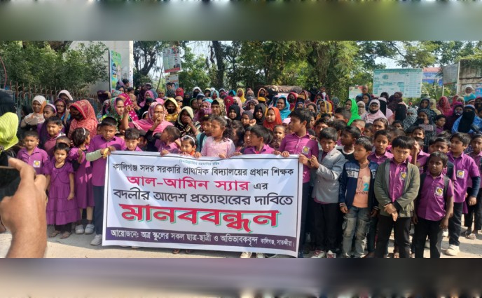 কালিগঞ্জে প্রধান শিক্ষক আল-আমিনের বদলির আদেশ প্রত্যাহারের দাবিতে মানববন্ধন