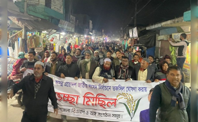 নির্বাচন কমিশন তফসিল ঘোষণার পরপরই বৃহস্পতিবার (১১ ডিসেম্বর '২৫) সন্ধ্যায় উপজেলা সদরে অবস্থিত দলীয় কার্যালয়ের সামনে থেকে নেতাকর্মীদের স্বতঃস্ফূর্ত অংশগ্রহণে মিছিলটি বের হয়।