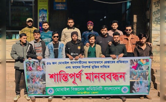 বৃহস্পতিবার (১৫ জানুয়ারি '২৬) সকালে সাতক্ষীরা শহরের সংগীতা মোড় এলাকায় মোবাইল কমিউনিটি বাংলাদেশের উদ্যোগে এ মানববন্ধনের আয়োজন করা হয়। মানববন্ধনে অংশগ্রহণকারীরা অভিযোগ করেন, কোনো সুনির্দিষ্ট অভিযোগ বা যথাযথ তদন্ত ছাড়াই ব্যবসায়ীদের গ্রেপ্তার করা হয়েছে, যা সম্পূর্ণভাবে হয়রানিমূলক ও অযৌক্তিক।